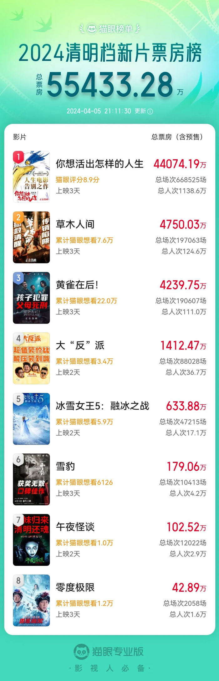 截至4月5日21时11分,云集8部新片的清明档累计票房已经破5.5亿元,第一名《你想活出怎样的人生》以超4.4亿元的票房遥遥领先。