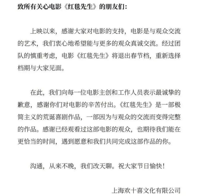 2月16日23时,《红毯先生》出品方发表声明,宣布《红毯先生》退出春节档,将重新选择档期与观众见面。