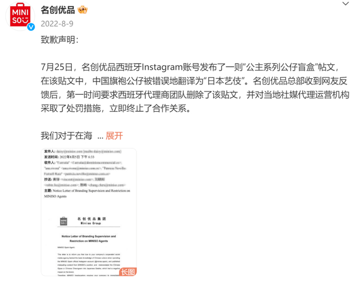 虽然在IP联名界混得风生水起,名创优品亦不乏“翻车”案例。除了此次联名Chiikawa被粉丝痛批,2022年8月9日,名创优品被曝曾在其西班牙社交账号上发帖,将一款穿着中国旗袍的盲盒公仔称作“日本艺伎”,引发网友热议。当晚,名创优品发布中文、英文、西班牙文三版致歉声明,称已第一时间删除帖文。