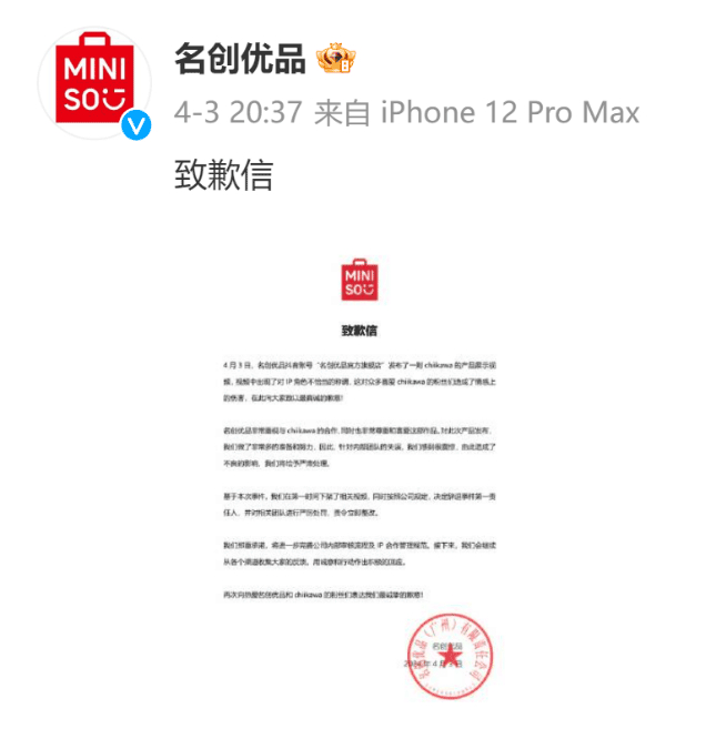 “针对内部团队的失误,我们感到很震惊,基于本次事件,由此造成了不良的影响,我们将给予严肃处理。我们在第一时间下架了相关视频,同时按照公司规定,决定辞退事件第一责任人,并对相关团队进行严厉处罚,责令立即整改。” 名创优品在致歉信中表示。