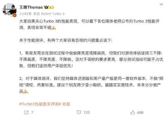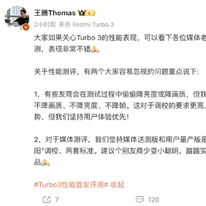 对于媒体评测的数据,Redmi品牌总经理王腾表示,1、有些友商会在测试过程中偷偷降亮度或降画质,但我们对游戏体验坚持三不降:不降画质、不降亮度、不降帧。这对于调校的要求更高,部分测试指标可能不占优势,但我们坚持用户体验优先!2、对于媒体测评,我们坚持媒体送测版和用户量产版是同一套软件版本,不搞“阴阳”调校、两套标准。建议个别友商少耍小聪明,踏踏实实做技术,本本分分做产品。