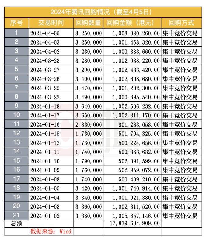 踏入今年二季度以来,腾讯的回购计划仍在进行中。具体看来,腾讯分别在4月2日、3日及5日斥资超10亿港元回购股份,这也使腾讯今年以来的回购总额达到178.4亿港元。如果腾讯继续以目前的规模和节奏进行回购,2024年全年,其回购股份总额有望超过腾讯此前公布的千亿年度回购计划下限。