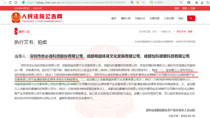 即“深圳市优必选科技股份有限公司、成都明益体育文化发展有限公司、成都怡科健康科技有限公司:本院受理的申请执行人周某向本院提出书面异议一案,已审查终结。因你们下落不明,现依法向你们公告送达本案(2024)川0191执异92号《执行裁定书》。裁定:一、追加第三人深圳市优必选科技股份有限公司为(2022)川0191执9456号案的被执行人,深圳市优必选科技股份有限公司在未缴纳出资4000万元范围内对四川山原体育产业发展有限公司不能清偿周某的债务承担补充赔偿责任。”