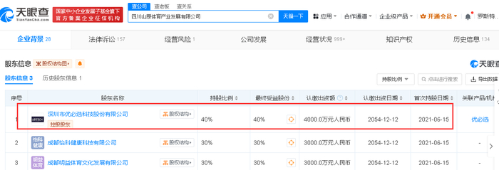 股权结构上,深圳市优必选科技股份有限公司持股40%,为控股股东,成都怡科健康科技有限公司、成都明益体育文化发展有限公司则分别持股30%,该三家股东分别认缴出资额为:4000万元、3000万元、3000万元。