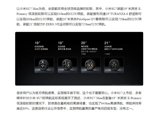 小米SU7 Max在配备19英寸米其林E-Primacy低滚阻轮胎的情况下,即使是在最耗电的高速场景,也实现了643km高速续航,续航保持率接近80%。