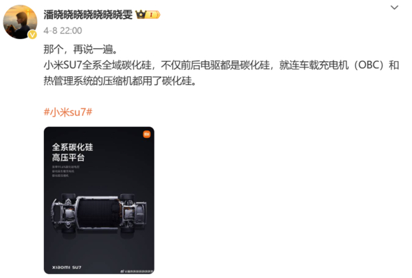 就在发布会结束后不久,小米汽车经理潘晓雯发文回应,称小米SU7全系全域碳化硅,不仅前后电驱都是碳化硅,就连车载充电机(OBC)和热管理系统的压缩机都用了碳化硅。对智己方面的言论进行了修正。