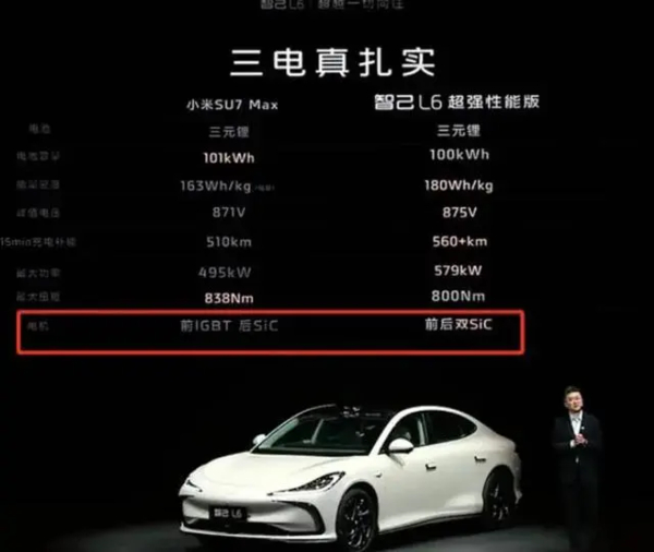 不过和小米不同的是,这次智己的发布会却出了岔子。在发布会比较二者的三电系统的环节中,智己称小米SU7 Max在电控上使用的是前IGBT,后SiC模块,而智己L6则是前后双SiC,因此比小米更加高级和良心。