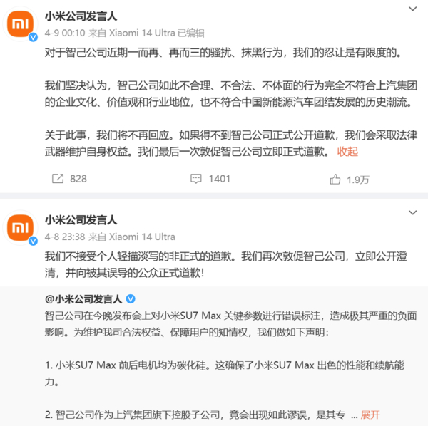 在刘涛道歉后,小米官方账号 @小米公司发言人就该事连发三条微博。该账号表示,智己公司在今晚发布会上对小米SU7 Max 关键参数进行错误标注,造成极其严重的负面影响。小米澄清称,小米SU7 Max 前后电机均为碳化硅。这确保了小米SU7 Max出色的性能和续航能力。