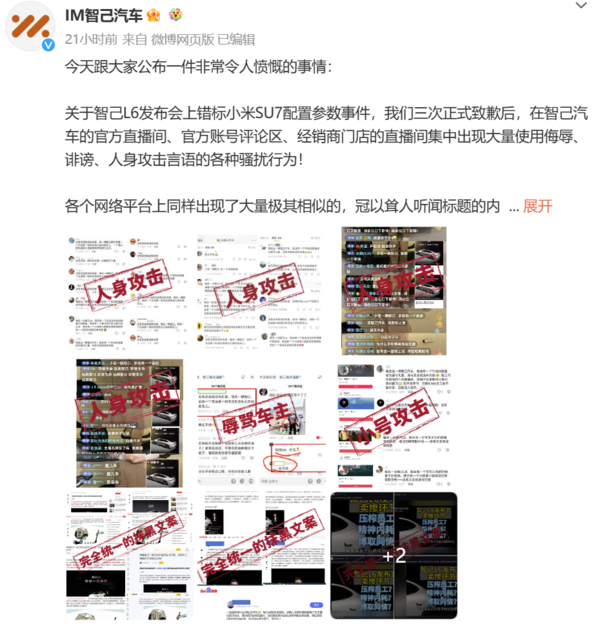 智己官方称遭网暴