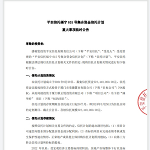 平安信托在公告中称,“福宁615号”信托计划项下尚无现金回收,按照相关信托文件约定,信托计划延期至信托财产全部变现之日或存续受益人预期信托利益足额分配之日(以先至者为准)止。