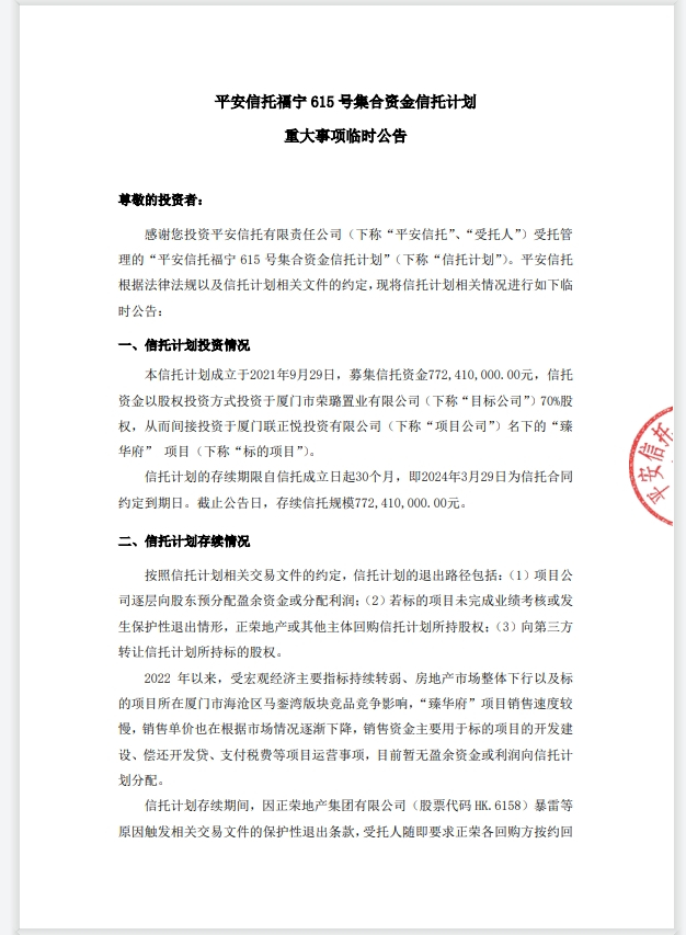 由于平安信托旗下“平安信托福宁615号集合资金信托计划”(简称福宁615号)兑付延期,4月10日,平安信托发布声明致歉,并表示正在通过持续跟进标的项目开发销售及资金回笼情况、对回购义务人正荣方提起诉讼、推进信托计划持有的标的股权的转让退出等方式积极推进项目处置。