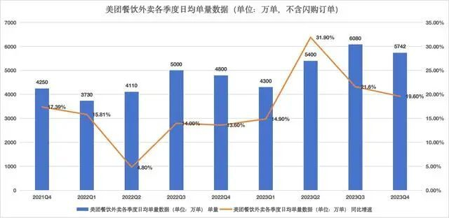 美团餐饮外卖各季度日均单量数据(单位:万单,不含闪购订单)