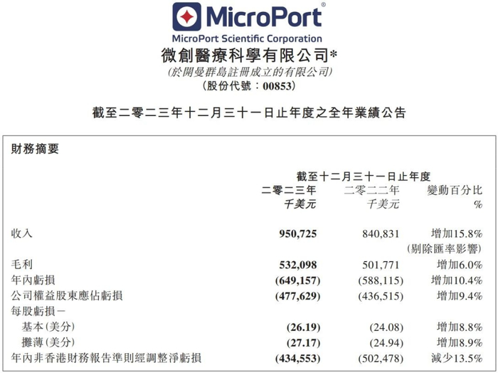 微创医疗的危机并非无迹可寻。事实上,自2020年算起,微创医疗已经连续亏损长达4年。根据企业年报,2023年,微创医疗实现营业收入9.51亿美元,同比增长15.8%。但在多元化发展战略下,微创医疗在2023年的净亏损额也高达6.49亿美元,同比扩大了10.4%,同期经营现金流出净额达到2.32亿美元。最近三年,微创医疗累计亏损超过100亿元。