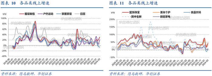 线上增速平稳仍高于线下。根据统计局数据,24年1-3月实物网上零售额2.8万亿元,同比+11.6%(vs.社零+4.7%),线上实物占比【商品零售】/【扣除汽车后商品零售】分别为26.20%(较去年同期-0.8pct)、29.3%(较去年同期-1.0pct),该行认为或涉及基数调整,整体线上占比应当仍有提升,以调整后基数计算线上实物占比商品零售较去年同期+1.79pct,线上实物占比扣除汽车后商品零售较去年同期+1.97pct。