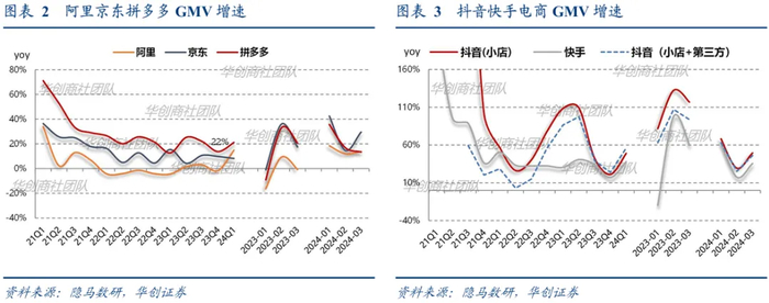市占率:根据隐马数研,24年3月计算GMV市占率:阿里淘天44.5%/京东19.4%/拼多多20.1%/抖音小店9.1%/快手6.9%,抖音小店+第三方平台成交额计算市占为11.4%。环比看拼多多、抖音、快手仍在提高市占率。