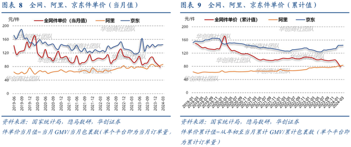 平均客单价大幅下滑。根据统计局与邮政局数据计算,24年1~2月全网包裹件平均单价78.3元/件,较去年同期下降28元/件。主要受拼多多与抖快低件单价平台占比提升影响,根据隐马数研数据,淘天与京东客单价均提升,1季度淘天同比+8.4%,京东同比+12%。