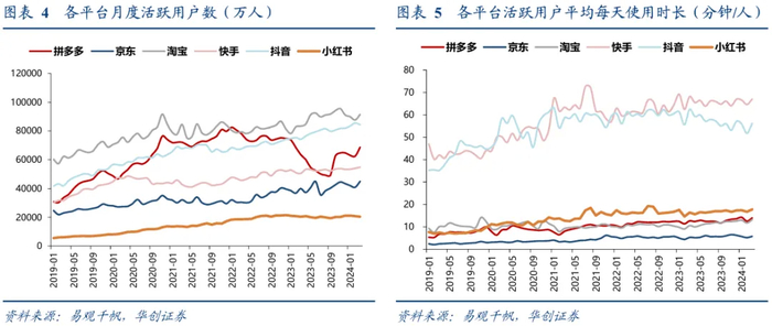 活跃用户:货架电商低价竞争带来MAU与使用时长显著增长。根据易观千帆数据,24年2/3月各大平台MAU:淘宝(2月8.8亿/3月9.1亿)/京东(2月4.1亿/3月4.5亿)/拼多多(2月6.2亿/3月6.9亿)/抖音(2月8.6亿/3月8.4亿)/快手(2月5.4亿/3月5.5亿)/小红书(2月2.1亿/3月2.0亿),3月MAU淘宝+10%/京东+13%/拼多多+8%/抖音+14%/快手+9%/小红书+0.2%;对应平台活跃用户平均使用时长分别同比淘宝+25%/京东+9%/拼多多+10%/抖音-10%/快手-1.7%/小红书+8.2%。该行认为1季度各大电商平台提高低价商品的供给与曝光,均导致MAU提升、使用时长增长。在低价策略与补贴的驱动下,尤其是淘宝与京东用户MAU同比呈现较高增长,短视频平台小红书用户增长近10个月呈现放缓态势,但用户使用时长增长。