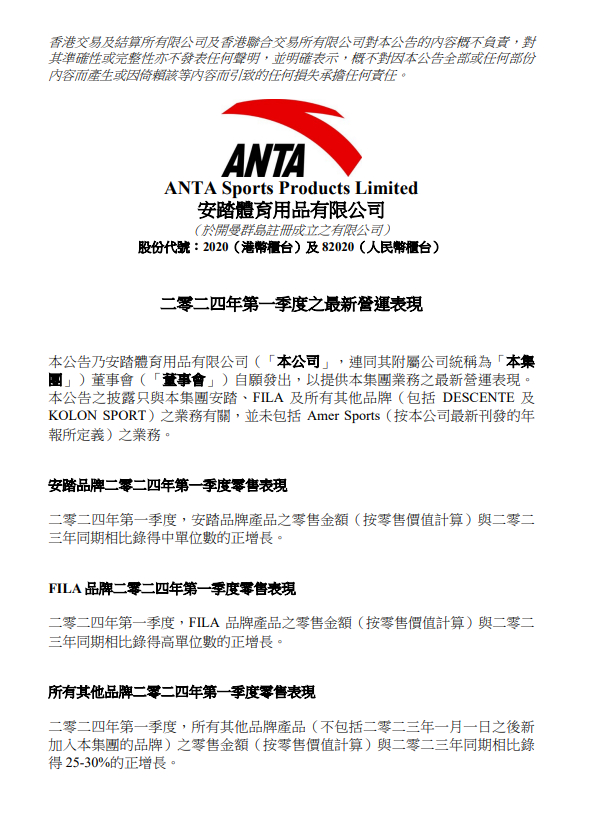 公告还指出,2024年第一季度,安踏的所有其他品牌产品(不包括2023年1月1日之后新加入集团的品牌)之零售金额(按零售价值计算)与2023年同期相比取得25-30%的正增长。