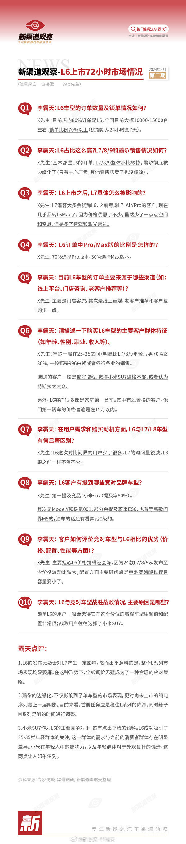 竞品方面,该先生表示,第一提及的竞品是小米SU7,统计率达80%。其次是Model Y和极氪001,部分会提及蔚来ES6,也有新款问界M5的,油车的话还有看奔驰C级的。锁单L6的用户一般会觉得它在这个价位的增程车型里颜值和配置非常顶,战败用户往往选择了小米SU7。