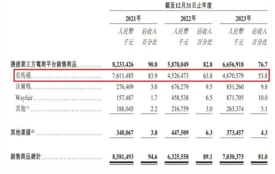 以傲基科技为例。招股书显示,2021-2023年,傲基科技来自亚马逊渠道的销售额占比分别为83.9%、63.8%和53.8%。
