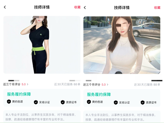 东郊到家平台上的签约技师绝大多数为女性,在东郊到家APP上,除了凸显身材的公式照之外,还能看到技师的生活照。这些对容貌、身材的特别展示,超出了介绍按摩服务的必要范畴。