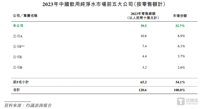 根据灼识咨询的报告,在细分的饮用纯净水市场,华润饮料在2023年的零售额达到395亿元,市场份额达32.7%,市占率第一,且超过排名第二至第五企业的总和。