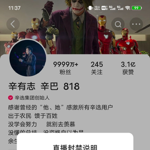 4月26日消息,快手辛巴账号显示,辛巴账号直播权限被封禁,将于2024年5月20日解封。