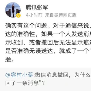 张军解释称,如果消息发送后,接收方无法得知是否已被对方收到,或者消息撤回后没有任何显示,那么消息是否成功送达就成了一个难以明确的问题。因此,微信在设计时选择了在消息撤回后仍给予提示,以确保通信的透明性。