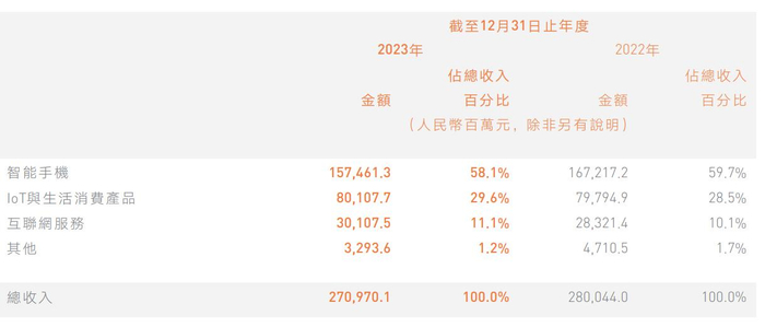 小米2023年来自智能手机收入为1575亿元,IoT与生活消费产品收入为801亿元,互联网服务收入为301亿元。小米2023年来自智能手机出货量为1.456亿台。
