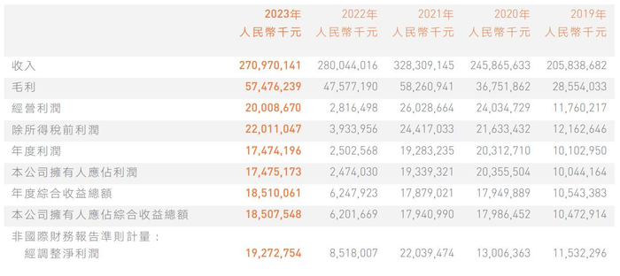 小米2019年、2020年、2021年、2022年、2023年营收分别为2058.39亿元、2458.66亿元、3283.1亿元、2800亿元、2709.7亿元;毛利分别为285.54亿元、367.52亿元、582.61亿元、475.77亿元、574.76亿元。