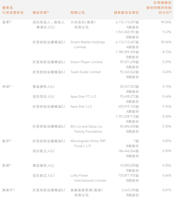 雷军、林斌拥有不同投票权的股权。其中,雷军拥有4,113,113,657股A类股,约占公司投票权的62.2%;林斌持有453,919,103股,占公司投票权的6.9%。