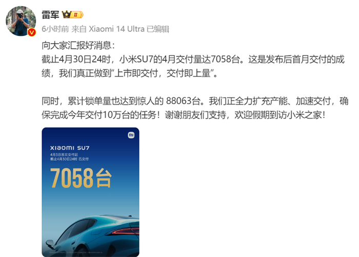 5月1日,小米集团创始人、董事长兼CEO雷军发微博称,向大家汇报好消息,截止4月30日24时,小米SU7的4月交付量达7058台。雷军表示:“这是发布后首月交付的成绩,我们真正做到“上市即交付,交付即上量”。同时,累计锁单量也达到惊人的 88063台。我们正全力扩充产能、加速交付,确保完成今年交付10万台的任务!”