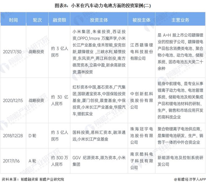 特别是2021年,随着小米正式宣布进军汽车制造业,其在新能源电池领域的投资步伐明显加快。在这一年里,小米不仅参与了赣锋锂电的融资项目,还投资了蜂巢能源。这一系列动作显示了小米对新能源汽车电池领域的重视和投入。