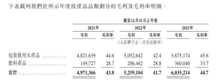 招股书介绍,华润目前是中国第二大包装饮用水企业以及中国最大的饮用纯净水企业。在报告期内(2021年-2023年),华润饮料分别实现收入113.40亿元、126.23亿元及135.15亿元;净利润分别约为8.58亿元、9.89亿元及13.31亿元人民币;综合毛利率分别为43.8%、41.7%、44.7%。可见“百年生意”的盈利能力十分稳定。