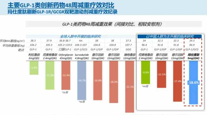 此前其在中国肥胖受试者中的最新II期临床数据表明,治疗48周后,玛仕度肽9 mg组体重较基线的平均百分比变化与安慰剂组的治疗差值达−18.6%,平均变化值达17.8kg;有51.2%的受试者体重较基线下降15%以上,34.9%的受试者体重较基线下降20%以上。以上成绩使得玛仕度肽在减重效果方面优于司美格鲁肽。