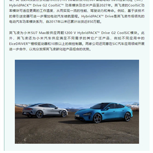 根据协议,英飞凌将为小米SU7 Max版供应两颗1200 V HybridPACK™ Drive G2 CoolSiC模块,并向小米汽车供应其他广泛的产品,如满足不同需求的EiceDRIVER栅极驱动器和10款以上的微控制器。这些产品基于CoolSiC功率模块技术,可以适应更高的工作温度,从而实现一流的性能、驾驶动力和寿命,基于该技术的牵引逆变器可进一步增加电动汽车续航里程。