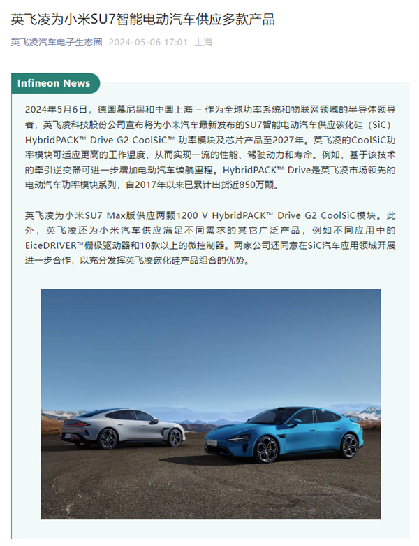 英飞凌与小米汽车达成协议:供应SU7碳化硅功率模块及芯片至2027年