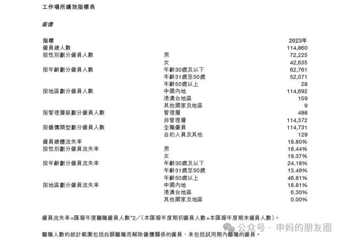 6、员工人数及比例:截至2023年底,美团共有员工114860人,按性别划分,男性72225人,女性42635人,比例为1.7/1;按年龄划分,30岁以下62761人,占比超过50%,31-50岁为52071人,50岁以上28人;按管理层级划分,管理层位488人(应该是L10总监及以上人员),非管理层114372;员工总体流失率为18.8%(不包括试用期离职员工),其中30岁以下员工流失率为24.1%;