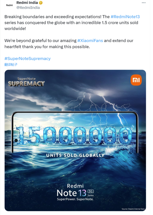 近日,小米在其印度官方账号公布了一项新的里程碑——Redmi Note 13系列全球销量已经突破了1500万台。Redmi在其官方账号中表示:“我们非常感激我们了不起的小米粉丝,感谢你们让这一切成为可能。”