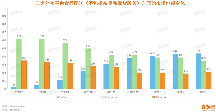 近日,Measurable AI发布了一组数据,按2024年一季度 食品 配送订单数量(不包括杂货和取货服务)来看,美团香港业务KeeTa的市占份额已达到44%,Foodpanda为35%,Deliveroo为21%,KeeTa成功跃升为香港第一大外卖平台。这距离美团进军香港市场不到一周年。