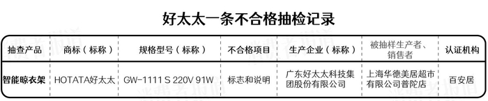 在2022年上海市产品质量监督抽查结果(第十批)中,好太太1款智能晾衣机被检出不合格,项目为“标志和说明”。