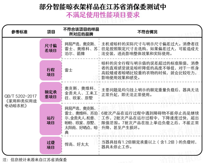 值得一提的是,目前专门针对智能晾衣架的国家标准仍未出台,本次性能测试参考的是行业标准。这在一定程度上反映出市售产品质量参差不齐。即便消费者选选择知名品牌如好太太、网易严选、苏泊尔等,仍可能遇到“翻车”情况。