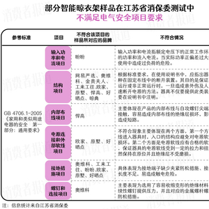 江苏省消保委参考GB 4706.1-2005《家用和类似用途电器的安全 第一部分:通用要求》和QB/T 5202-2017《家用和类似用途电动晾衣机》,在测试中发现有10批次样品存在电气安全方面的问题,涉及输入功率和电流、内部布线、接地措施等项目。有样品在使用中会有过负荷的危险,也有样品可能带来触电危险。