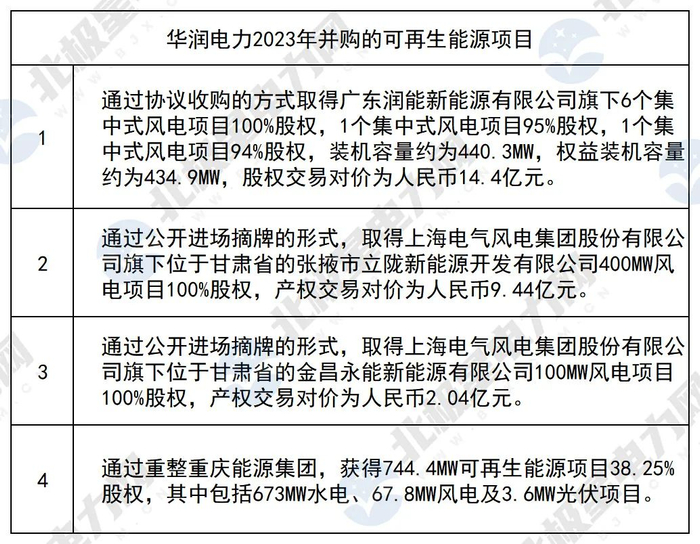 2023年,华润电力也在积极并购可再生能源项目。2023年,华润电力并购可再生能源权益装机约122万千瓦,除了通过协议及公开摘牌形式收购新能源资产,华润电力重整重庆能源集团也获得了74.44万千瓦可再生能源。