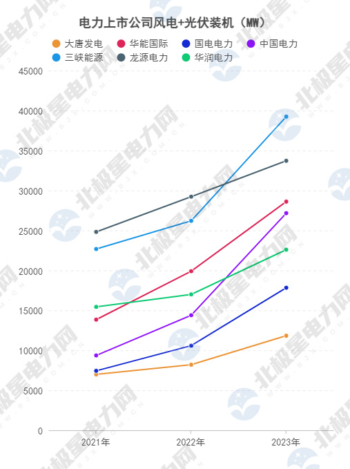 2023年,三峡能源、中国电力新增装机均超1000万千瓦;华能国际新增装机1000.39万千瓦,其中风光装机885.89万千瓦;国电电力新增装机819.87万千瓦,其中风光装机724.57万千瓦;华润电力运营权益装机容量新增超700万千瓦,自建风光新增装机645.8万千瓦,并购可再生能源装机122万千瓦。