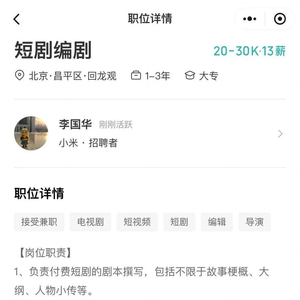 至于岗位职责,小米明确表示该岗位需要负责付费短剧的剧本撰写,包括不限于故事梗概、大纲、人物小传等;熟悉剧本开发流程,有良好的协调沟通能力、剧本把控能力、对剧本策划方向和内容质量负责;有丰富的阅片量,有良好的审美能力,熟悉了解下沉市场的短剧需求,了解爆款剧的内容。