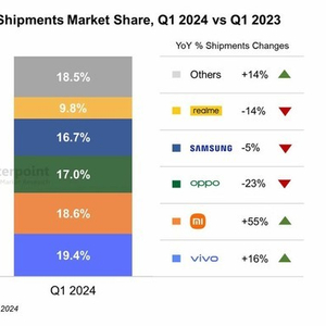 另外,在该季度中,5G智能手机出货量同比增长77%,占智能手机总出货量的29%。vivo和OPPO在这方面的表现最为突出,合计市场份额达到39%。