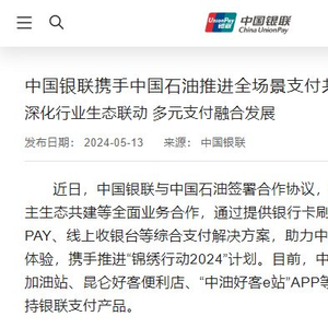中国银联与中国石油持续深化行业生态联动,“中油好客e站”小程序将于今年正式入驻云闪付APP,打造面向不同客群的多样化解决方案,进一步提升银联用户支付便利性,共同打造“人·车·生活”生态圈。此外,银联近期将联合中国石油及多家商业银行,陆续启动加油场景“锦绣中华支付无忧”主题系列营销活动,为车主带来加油用车优惠,打造更包容、更便利、更优惠的支付环境。