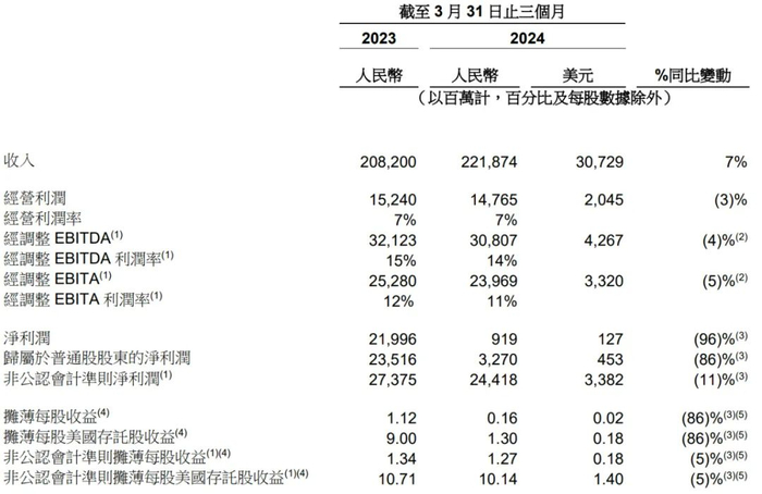阿里2024年第一季度营收为2218.74亿元(307.29亿美元),同比增长7%;经营利润为147.65亿元(20.45亿美元),同比下降3%;净利为9.19亿元(约1.27亿美元),同比降96%。