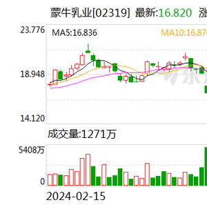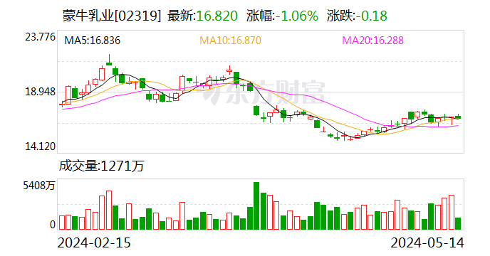 截至5月15日收盘,蒙牛股价下跌1.06%,报收16.82港元/股,总市值仅为661.92亿港元。和最高点52.632港元/股相比,股价已经跌去近七成,市值蒸发了近1400亿港元。